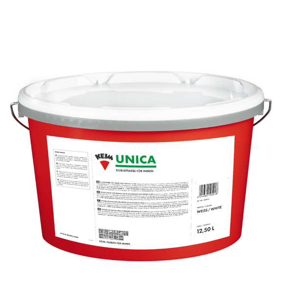 KEIM Unica ist eine anwendungsfertige Innenfarbe auf Silikatbasis nach DIN EN 13 300 (erfüllt auch die Anforderungen nach DIN 18363 Abs. 2.4.1, Dispersionssilikatfarbe).